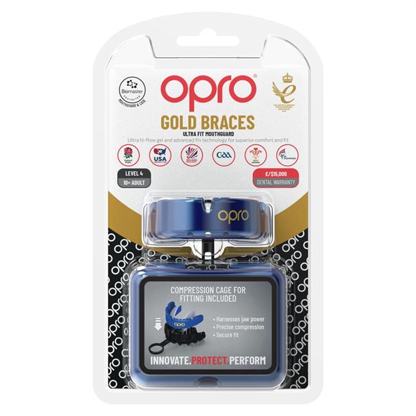 Krijg een van de hoogste niveaus van bescherming met de Gold Ultra Fit Mouthguard Braces van OPRO, speciaal voor beugels! Uiterst comfortabel, met een veilige pasvorm die gemakkelijk over een vaste beugel past. Het bitje is eenvoudig te gebruiken. Door de compressiekooi en de gepatenteerde vintechnologie, is er een uitstekende pasvorm voor jouw gebit. Bescherm je glimlach dankzij de ultra-impactbestendige tweelaagse constructie. Wat je sport of stijl ook is, doe het met OPRO.